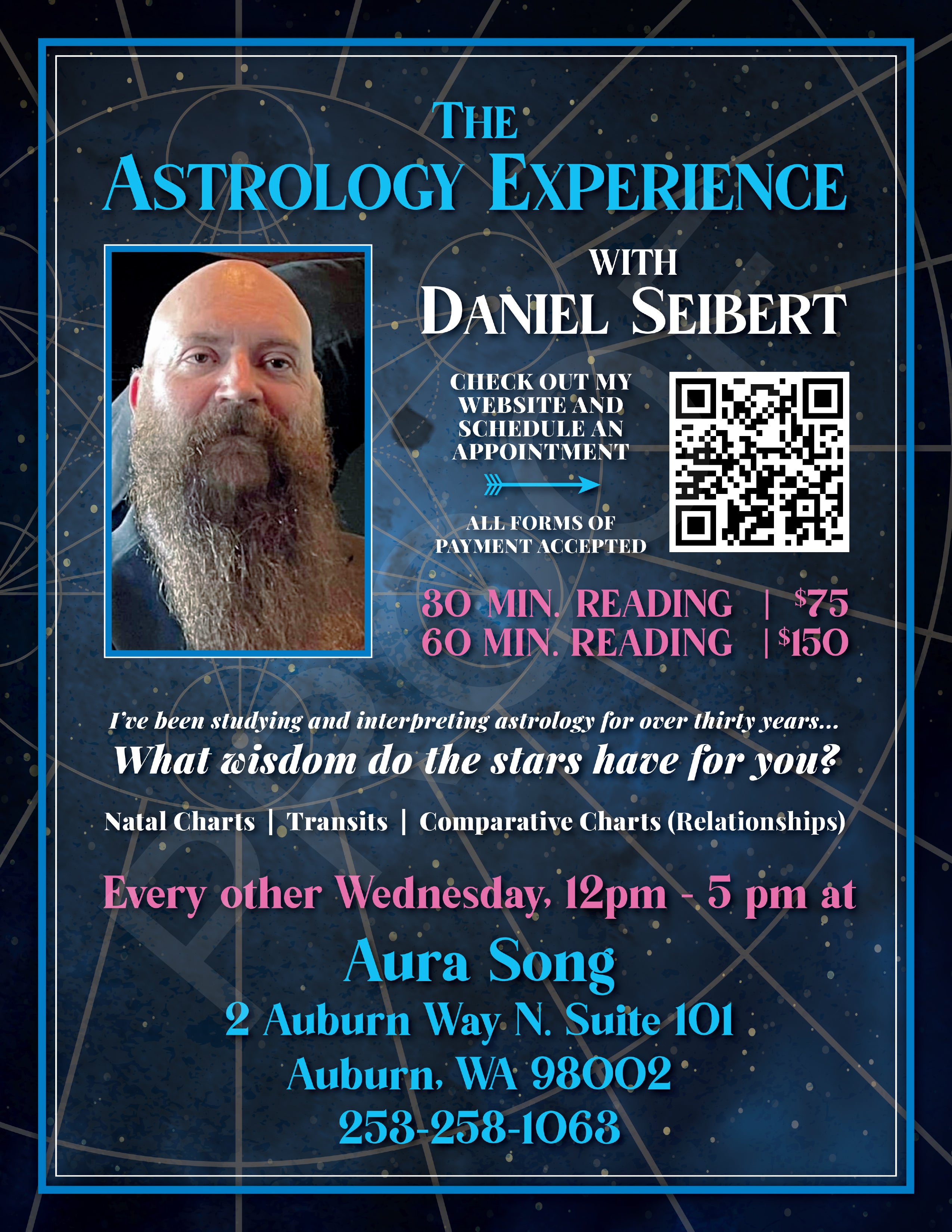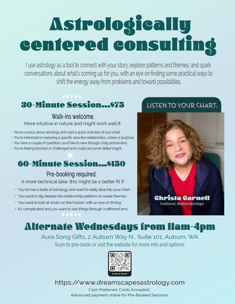 By appointment only. Services and classes are payable by cash only please. By agreeing to receive a spiritual consultation, an astrology chart reading, a psychic or intuitive reading, or taking a spiritual development class, you agree that any information provided does not constitute counseling, therapy, legal, financial, business, psychological, medical or other professional advice. Choices and actions based on the contents of the message, reading or service provided are your responsibility. The consultations and readings provided are presented only as another avenue of alertness, wisdom, motivation, inspiration, and are not a substitute for professional care. For entertainment purposes only.